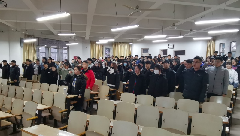 学院党总支负责人从校规校纪、作弊处理、考前复习以及疫情防控四个方面向同学们进行了详细的讲解,他希望同学们严肃考风考纪,不负青春;同时倡导同学们要劳逸结合,早睡早起,在考试期间要做好个人防护。会上还分别宣读了违纪处理规定和考试违纪处理程序,引导学生切实增强诚信考试意识。学生代表宣读了诚信考试承诺书,现场的同学们进行了诚信考试宣誓活动。团总支负责人就放假前的学生安全工作做了详细安排和部署,特别强调了电信诈骗、离校宿舍内务整理、交通安全、疫情防控以及人身财产安全等几个方面。